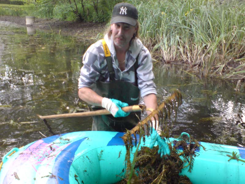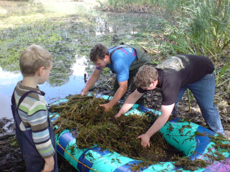Dann ging es weiter ohne Rücksicht auf die Kleidung. Die Uferböschung mußte entrümpelt und bereinigt werden und das stark verkrautete Gewässer um einen Teil seines Pflanzenbewuchses erleichtert werden. Von mir ein Lob an die Jugend, die zahlreich und kräftig anpackte.