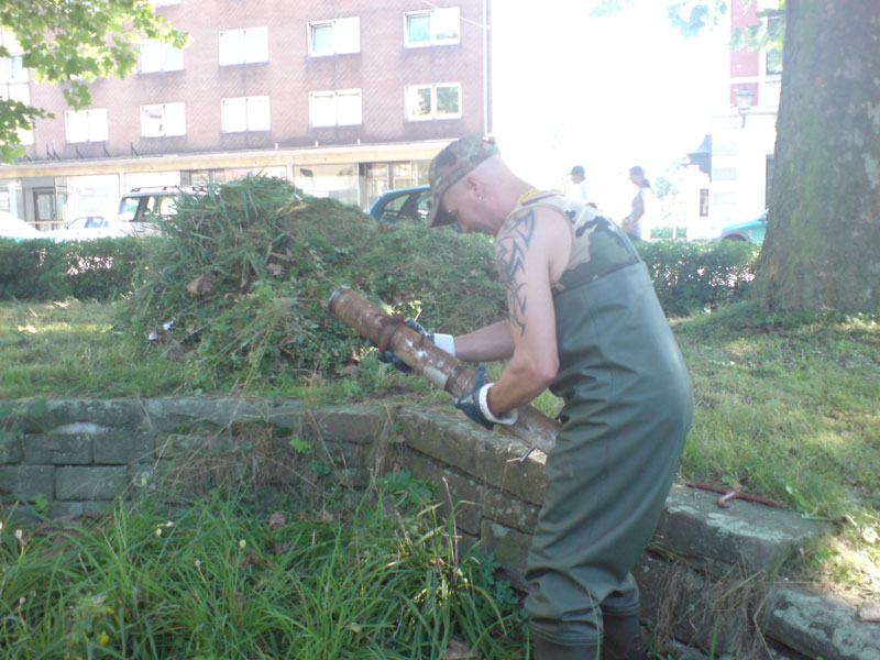 Wasser ablassen, Unrat aus dem Wasser holen, Rasen mähen, Hecken scheiden, Müll aufsammeln, Böschung reinigen und zurücksensen, den Grünschnitt und Müll konzentieren und Wasserstand widerherstellen. |